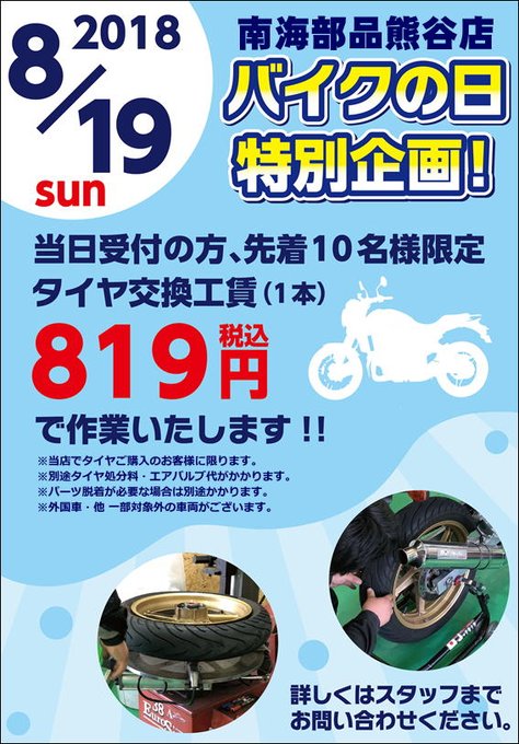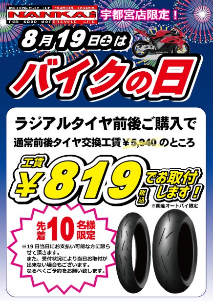 ট ইট র 南海部品太田店 8月19日は バイクの日 南海部品太田店では ラジアルタイヤ前後同時購入で国産車の前後タイヤ交換工賃が 819 になります ご予約先着10名様のみの限定企画でございます まだ空きがございます 是非ご利用くださいませ バイク