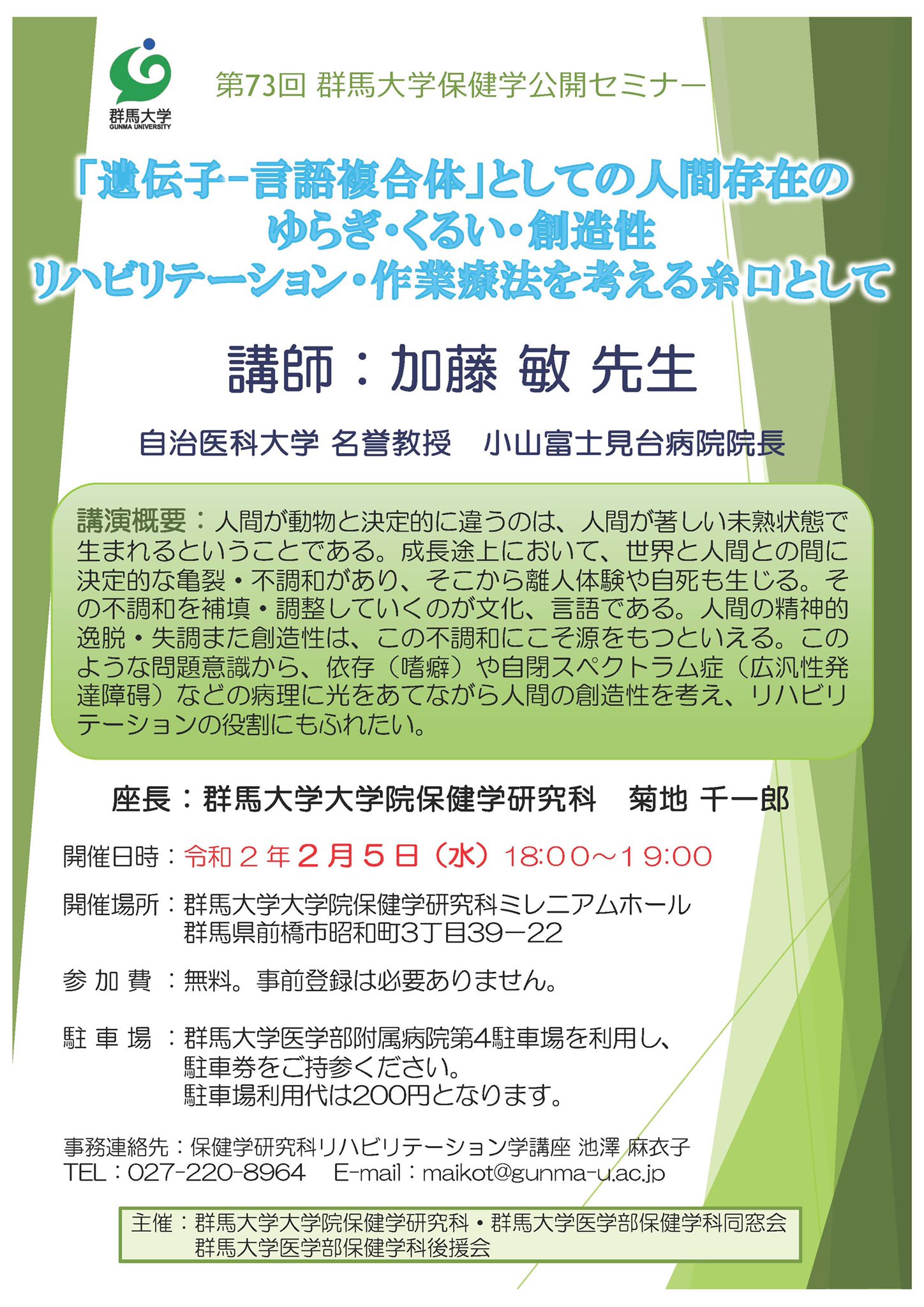 Gundai Ot On Twitter 2月5日は 群馬大学保健学公開セミナー があります 講師は自治医科大学名誉教授 小山富士見台病院院長の 加藤敏 先生です 事前登録や参加費は不要です お気軽に御参加ください 菊地 群馬大学 保健学科 作業療法学