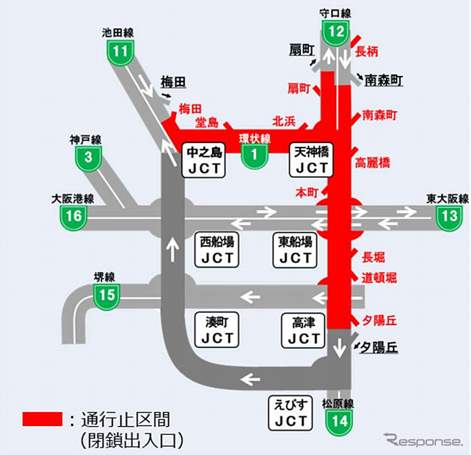 阪神高速 環状線 南行 11月10日から20日まで終日通行止 周辺道路で激しい渋滞予測 レスポンス Response Jp